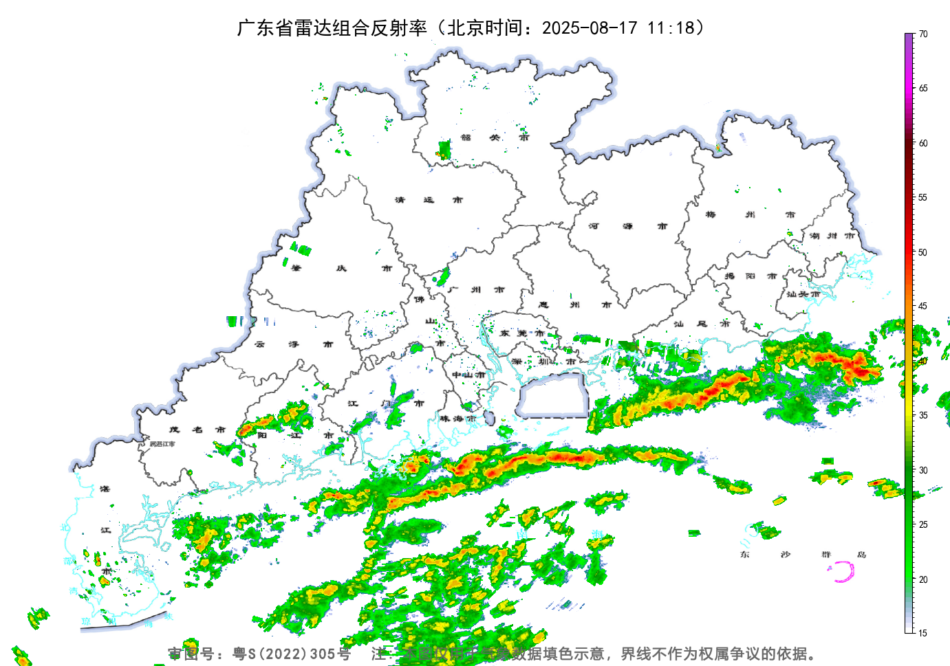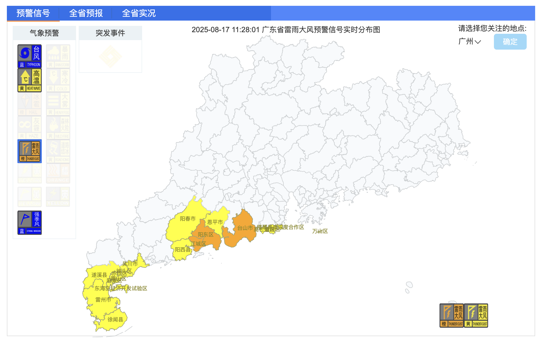 从广东气象雷达图可见,截至17日11时18分,热带低压的外围雨带已从南海登上广东沿海陆地。截至17日11时28分,江门、阳江等市,有市县区发布雷雨大风橙色预警信号;湛江、珠海等市,有市县区发布雷雨大风黄色预警信号。