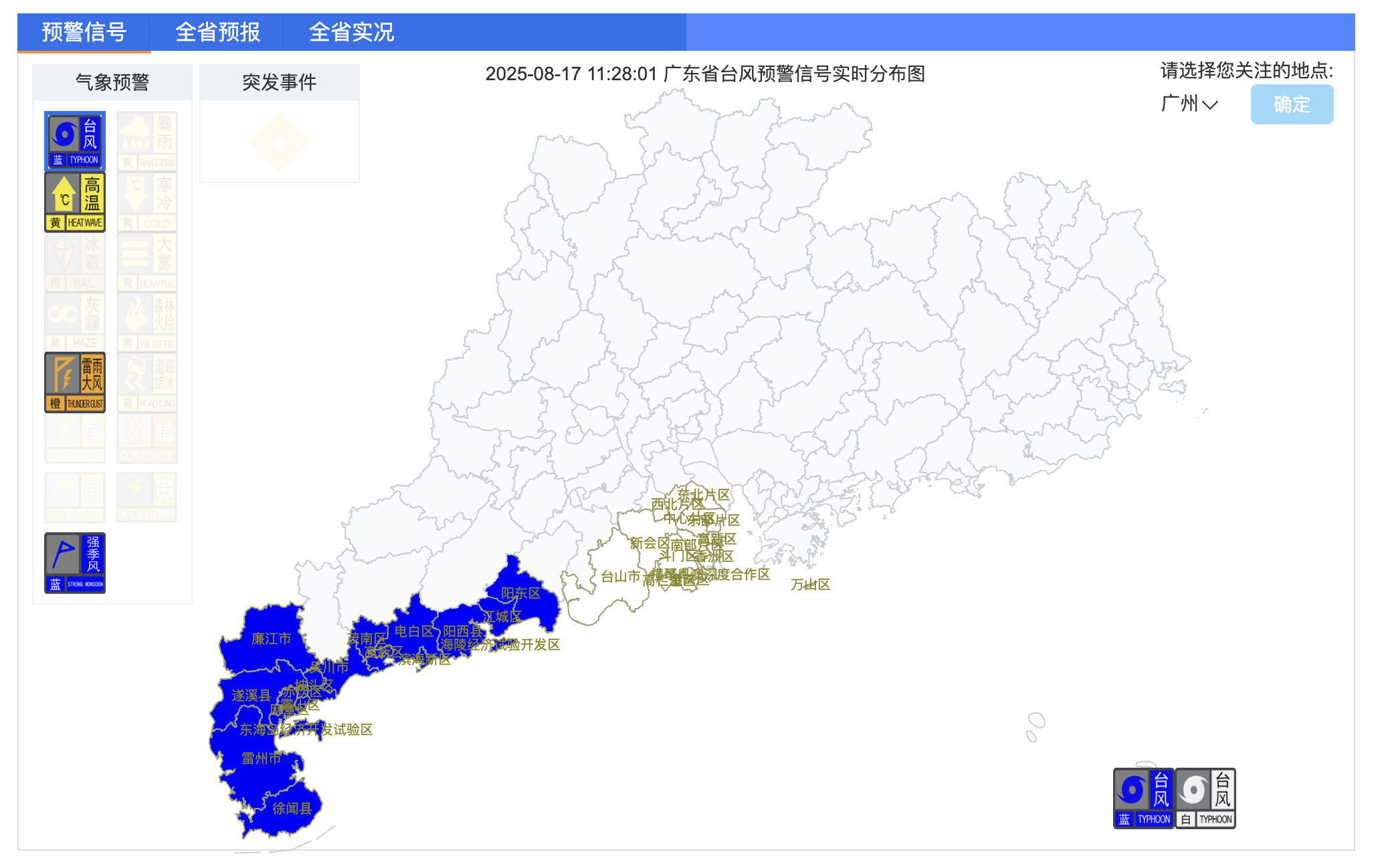 热带低压登陆广东的可能性在下降,但其风雨依然会影响广东。截至17日11时28分,湛江、茂名、阳江等市,均有市县区发布台风蓝色预警信号;江门、珠海、中山等市,均有市县区发布台风白色预警信号。