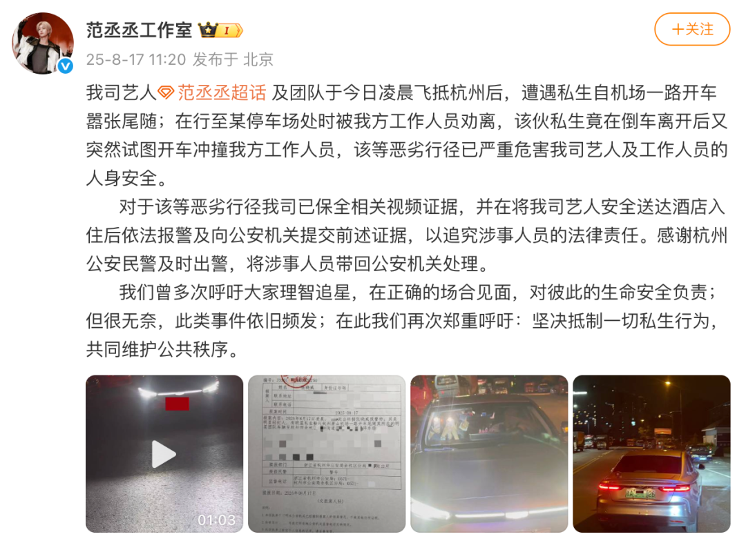 8月17日,范丞丞工作室发文称,艺人及团队遭私生粉开车嚣张尾随,被劝离后私生粉试图开车冲撞工作人员,涉事人员已被带回公安机关处理。