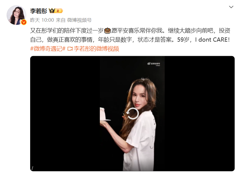 李若彤表示:又在“彤学”们的陪伴下度过一岁,愿平安喜乐常伴你我。继续大踏步向前吧,投资自己,做真正喜欢的事情,年龄只是数字,状态才是答案。59岁,I don't care!