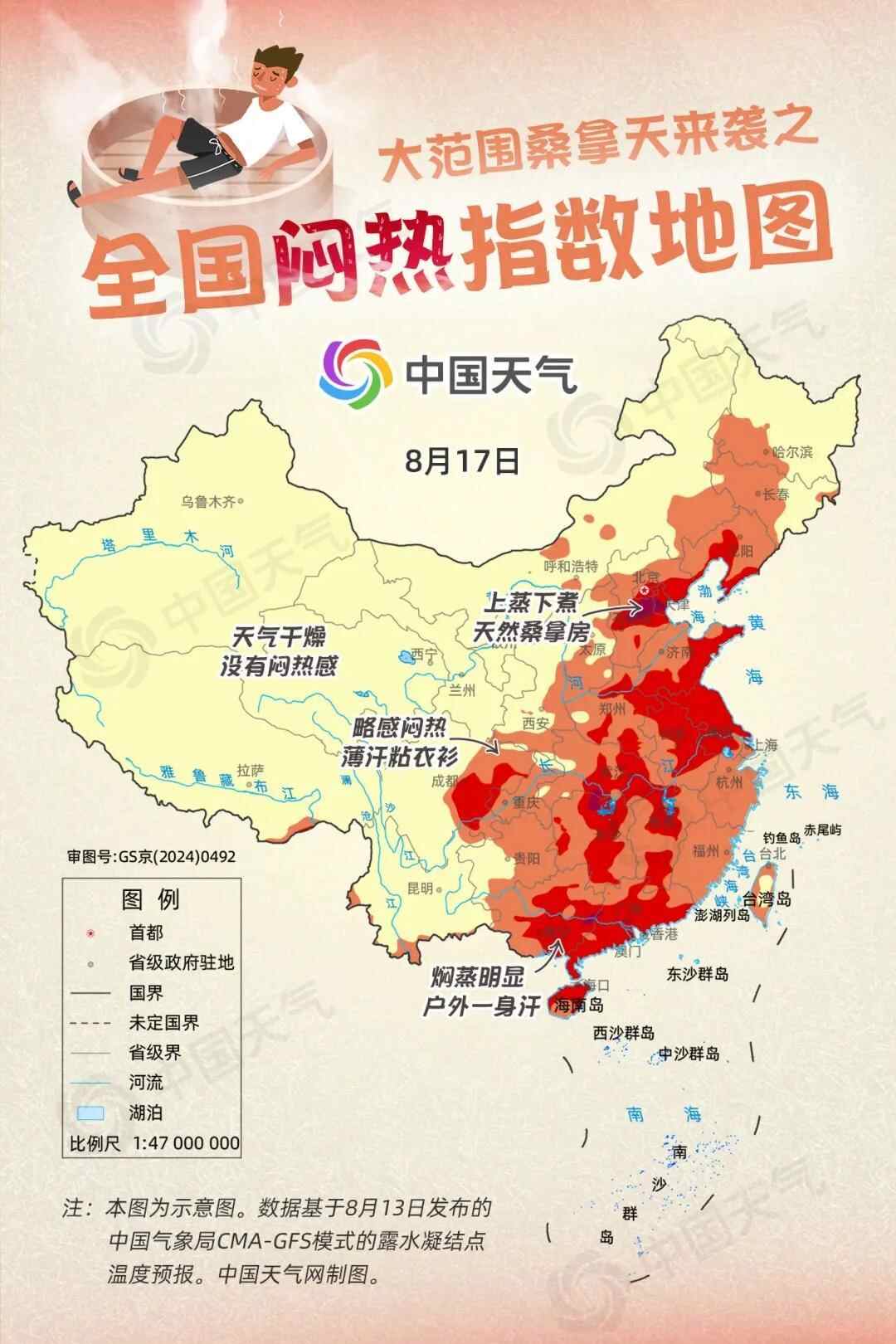 不仅最高气温高,未来7天,黄淮到长江流域空气湿度大,午后闷热感也将十分突出,体感温度普遍在40℃或以上,其中四川盆地、湖北、河南、浙江等地的部分地区体感温度可达45℃左右。