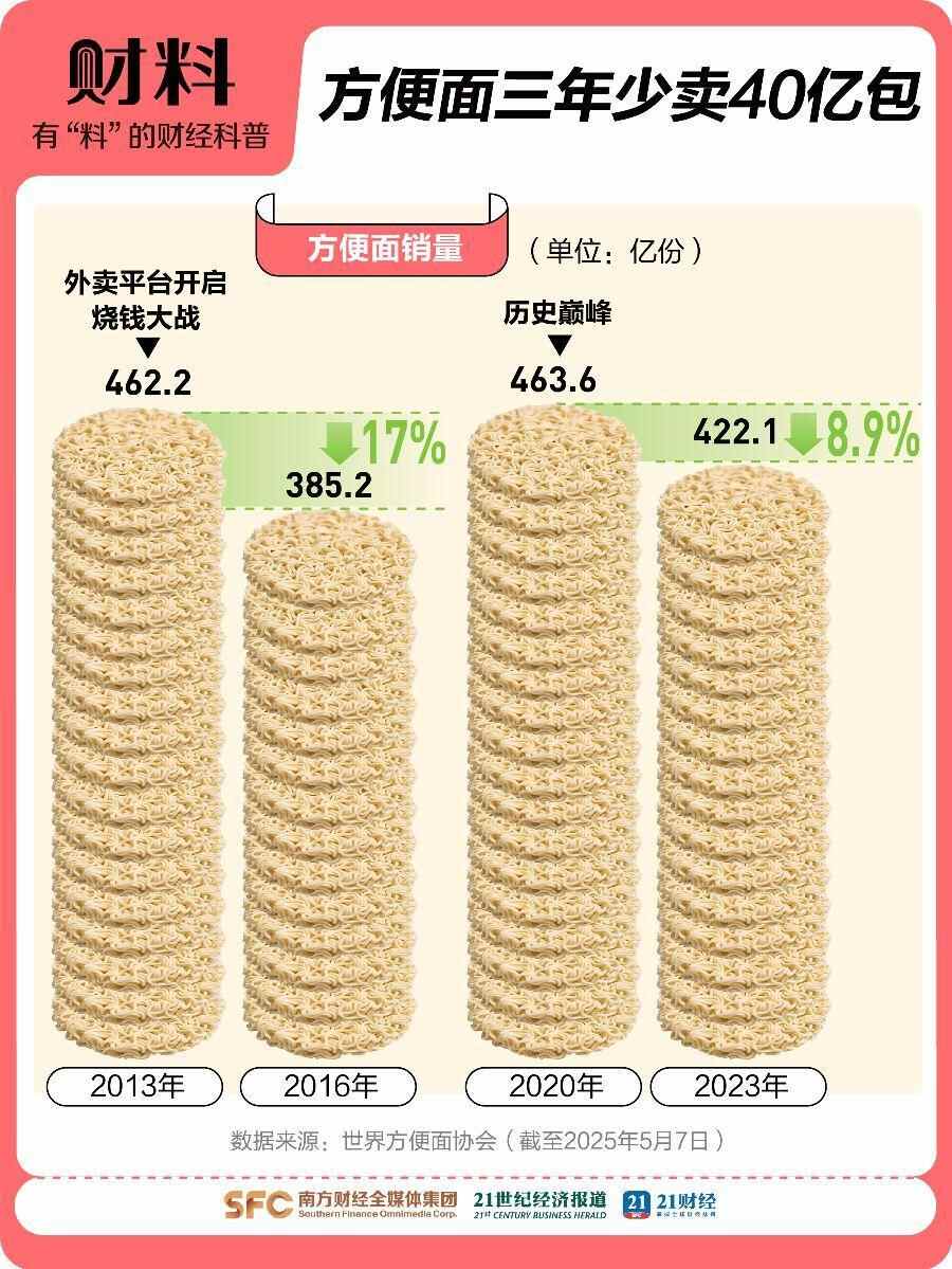 据世界方便面协会数据统计,2020—2023年,方便面3年消费量减少40亿包,2024年方便面消费量跌至438亿包,2025年Q2方便面销售额还在同比下滑8.9%,曾经的国民速食,光环似乎渐渐褪去。