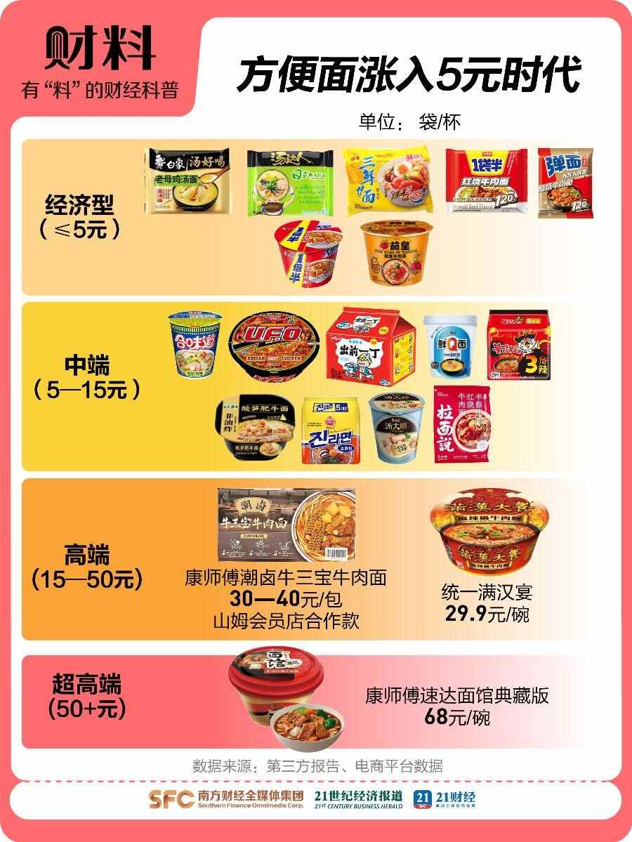 另一方面,方便面也开始越卖越贵了,曾经5元以下能拿下的经典款,如今动辄涨到6元,轻奢款方便面已经卖到15—20元价格带,康师傅与山姆合作的高端款方便面甚至卖出79.9元的价格。