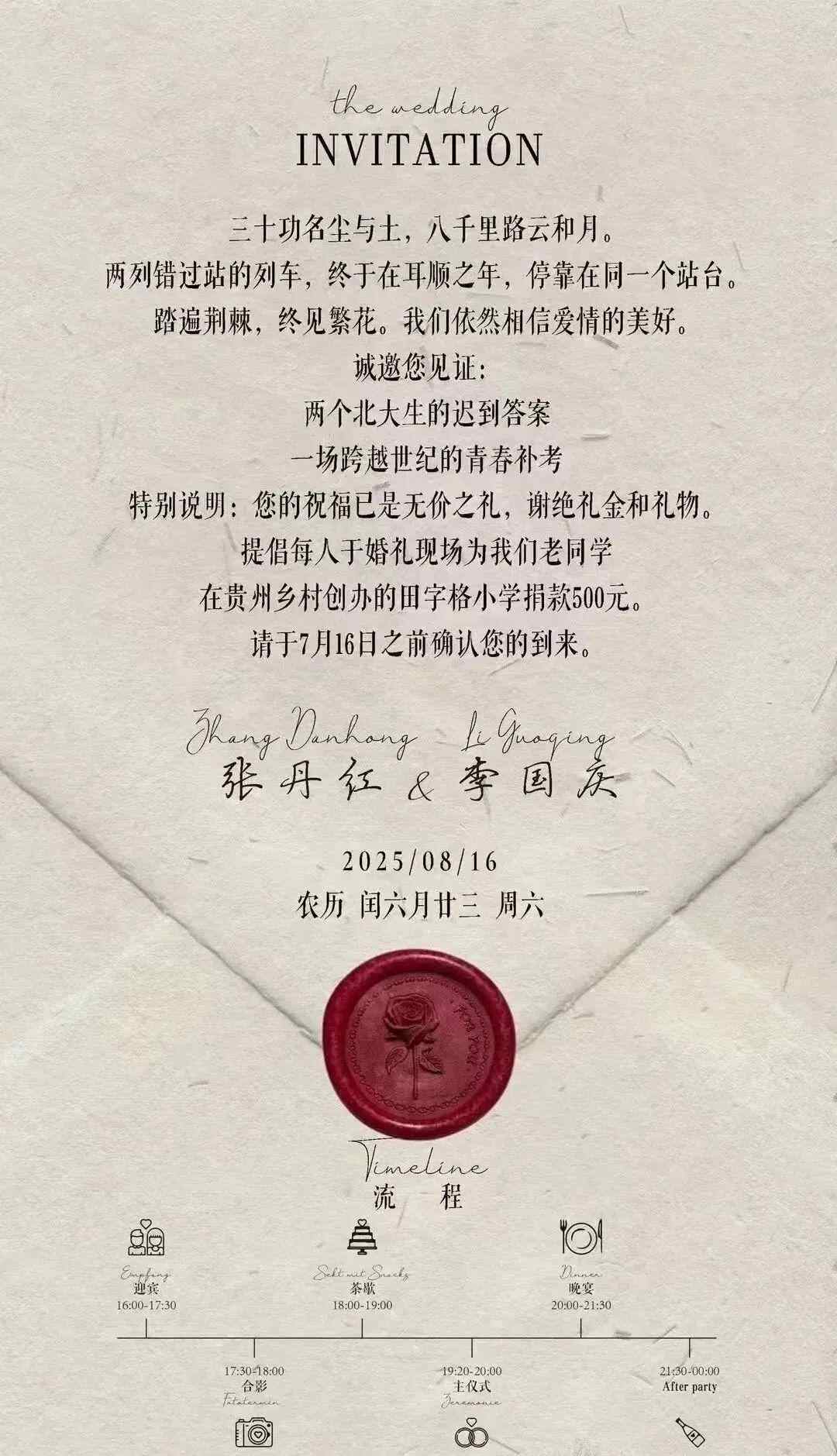 请柬显示,“谢绝礼金和礼物,提倡每人于婚礼现场为我们老同学在贵州乡村创办的田字格小学捐款500元”。