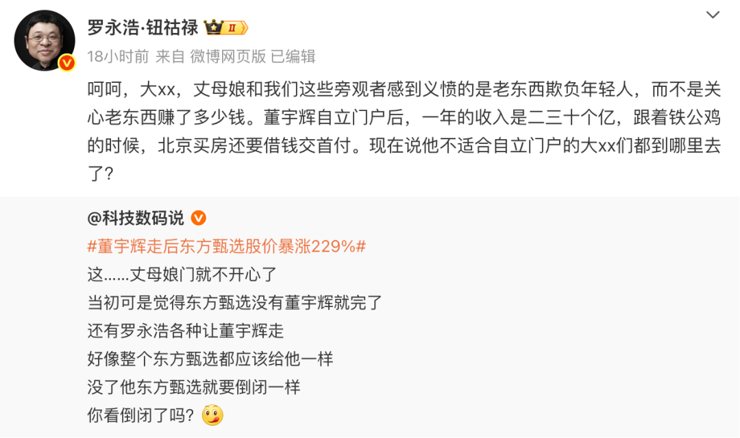 据媒体报道,此前有网友发帖称:“董宇辉走后东方甄选股价暴涨229%,这丈母娘们(董宇辉的粉丝)就不开心了,当初可是觉得东方甄选没有董宇辉就完了。还有罗永浩各种让董宇辉走,好像整个东方甄选都应该给他一样,没了他东方甄选就要倒闭一样,你看倒闭了吗?”