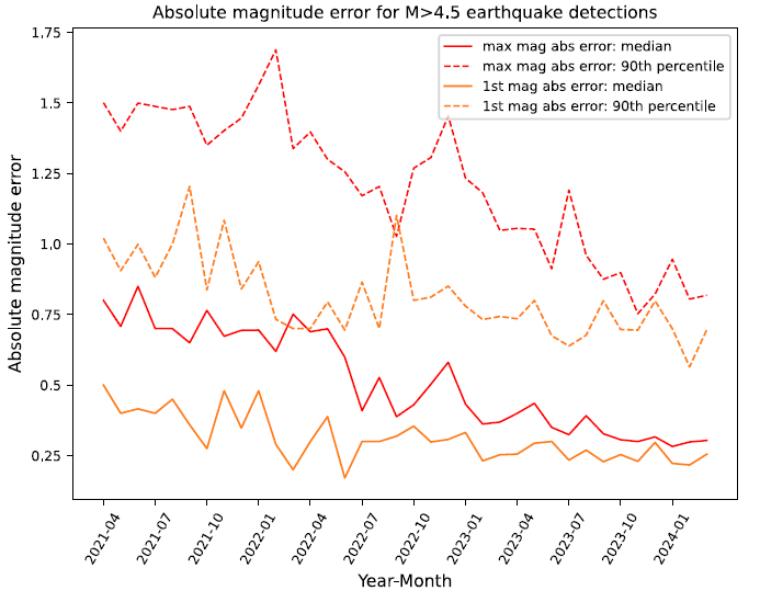 在过去三年里,随着检测系统的不断改进,AEA的震级估算准确性有了显著提升,首次震级估算的绝对误差中位数从0.50降低到了0.25。