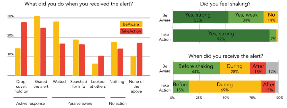 在所有受访者中,85%的人表示预警“非常有帮助”。36%的人表示在有震感之前收到了警报,28%的人在有震感期间收到,23%的人在震感结束之后收到。