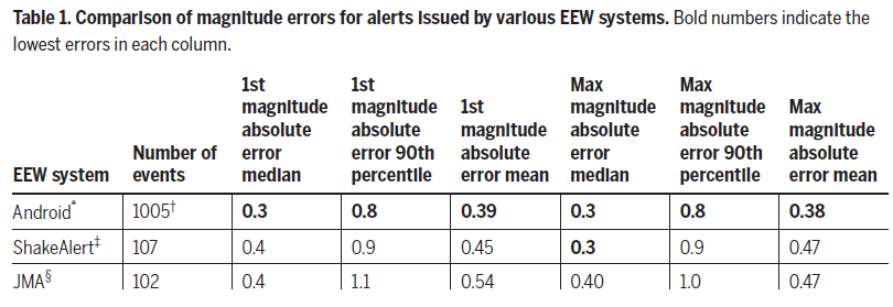 AEA和ShakeAlert都使用4.5级的警报阈值,并且误差较低。JMA的误差略高,但它也只针对更大的地震发出警报。