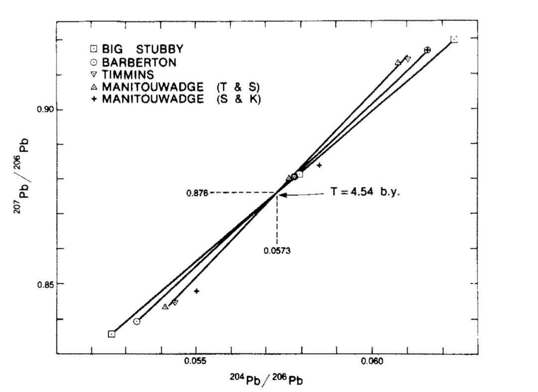 此外, Tera(1981)还通过绘制放射成因207Pb/206Pb与以204Pb/206Pb表示的来源组成的关系,为四个古老方铅矿构建了来源剖面。在此分析中,他得到的交点对应的T值为45.4亿年(4.54 Ga)。他认为该年龄可能代表了形成地球的原始物质中铀-铅分馏的时间。如果这种分馏发生在地球积聚的时期或非常接近该时期,那么这个年龄就是地球的年龄。如果不是,则它代表了形成地球的物质碎片的年龄。