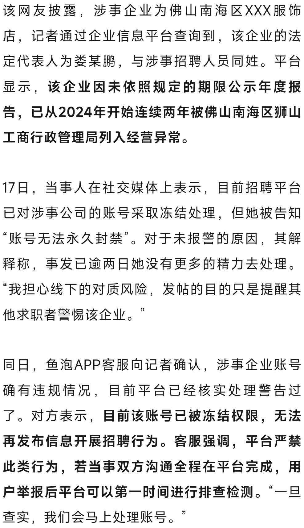 16日,该网友向记者确认,求职平台为鱼泡APP,目前她已经在该平台进行了相关投诉,但她认为平台处罚力度不够,正在等平台的进一步反馈。“发出来也是想让大家找工作避雷,别遇到这样的公司。”