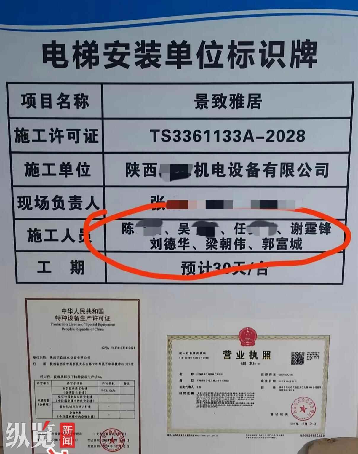 陕西西安一小区的“电梯安装单位标识牌”上的施工人员名单,竟出现了谢霆锋、刘德华、梁朝伟、郭富城的名字,是同名同姓还是故意为之?8月15日,记者联系到负责电梯安装的现场负责人张先生,他表示这是一场“乌龙”,4个名字是广告公司擅自加上去的,工人张贴时也未进行检查。目前,该标识牌已经进行更换。
