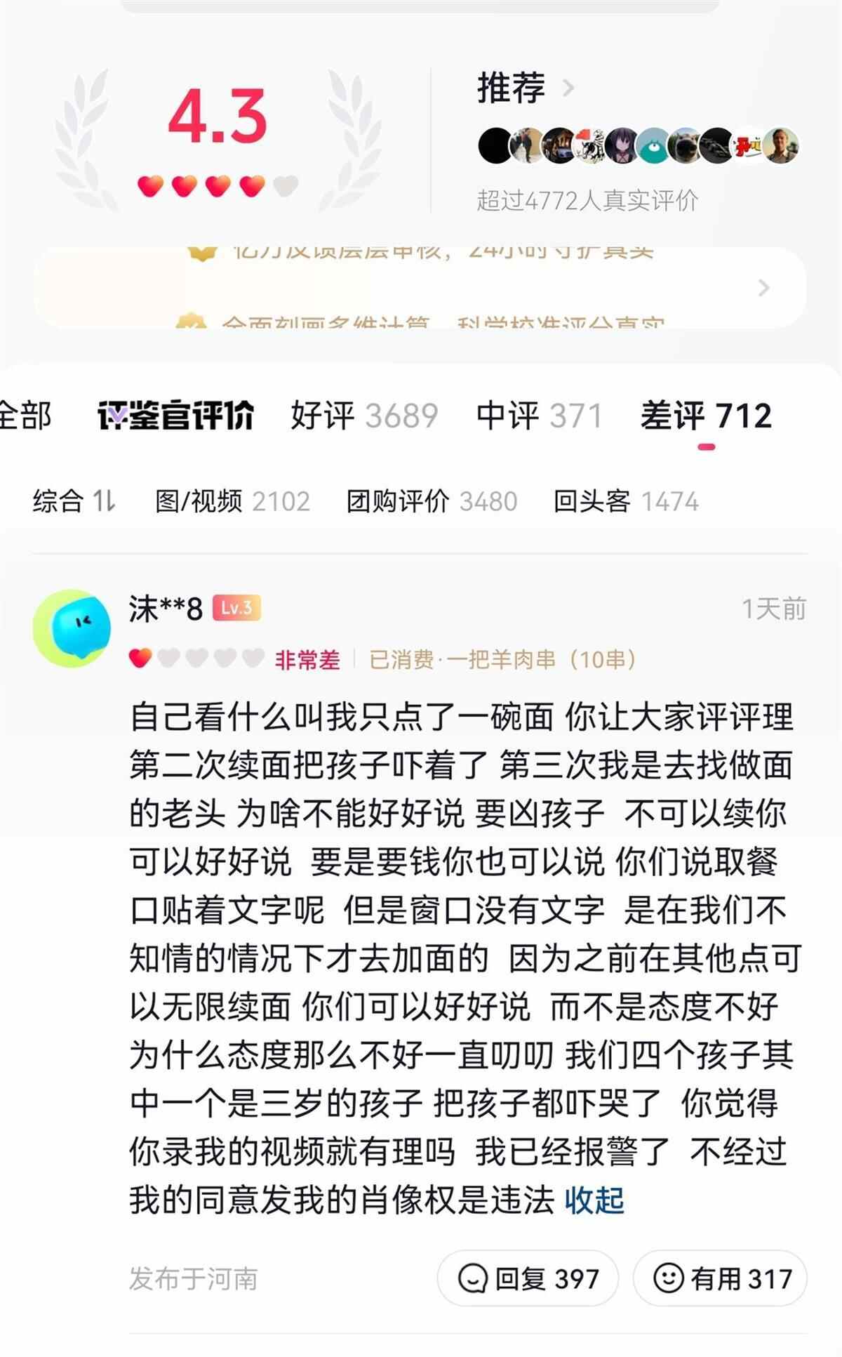 据此前报道,涉事餐馆老板霍先生称,13日三名成年女子带着四名儿童(共7人)到店消费。他们点了13元的饸饹面、18元的涮毛肚、两份凉菜以及一份15.8元的团购羊肉串,账单总额70余元。用餐过程中,几个大人分别为同行的孩子免费续面两次。