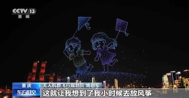 无人机群飞行规划员 姚利军:今天晚上有两个小孩在放风筝的图案,这就让我想到了我小时候去放风筝,童年的这种乐趣在成年的时候以科技的形式展现了出来,这种感觉很奇妙,也希望传达给更多的人,大家在看无人机表演之后能够感觉更开心、更快乐。