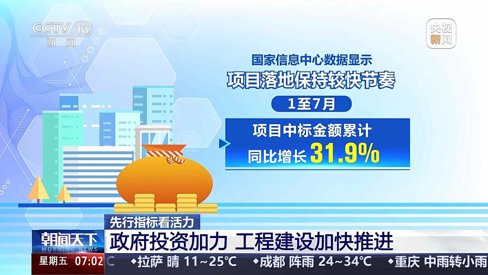 基础设施建设加快的背后,是政府投资的加力提效。中标是项目落地的“第一步”,其金额也是观察投资热度的先导指标。国家信息中心对招中标数据监测分析显示,项目落地保持较快节奏,1至7月项目中标金额累计同比增长31.9%。