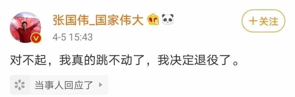 2020年初,张国伟宣布退役,他写道:“对不起,我真的跳不动了,我决定退役了。”