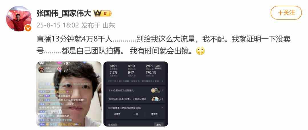当晚,张国伟在直播结束后在个人微博发文:直播13分钟就4万8千人......别给我这么大流量,我不配。我就证明一下没卖号......都是自己团队拍摄。我有时间就会出镜。