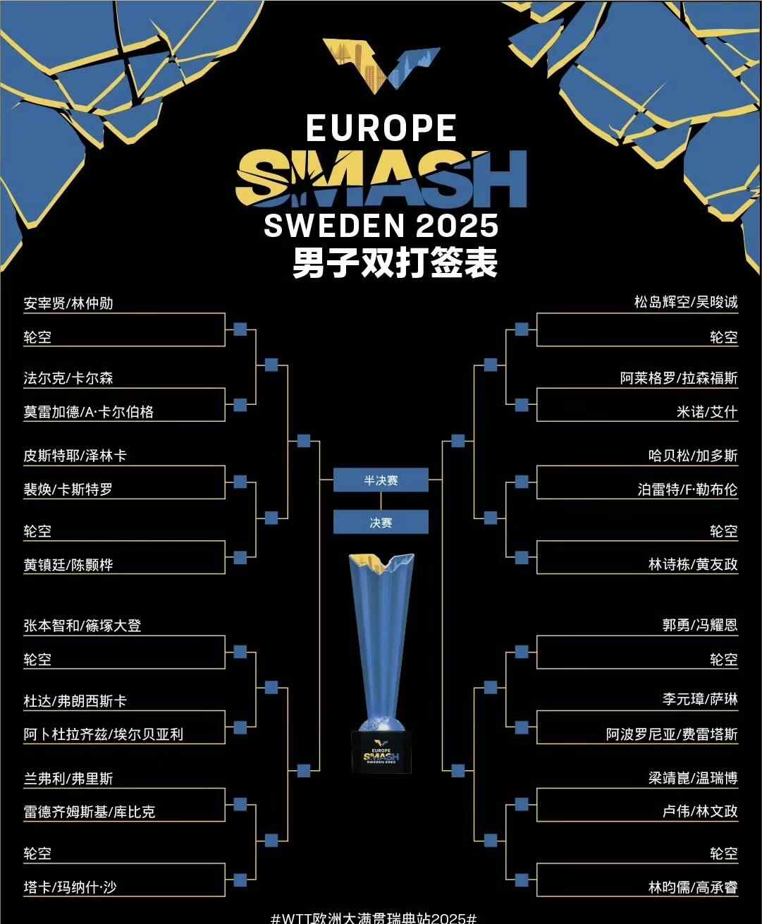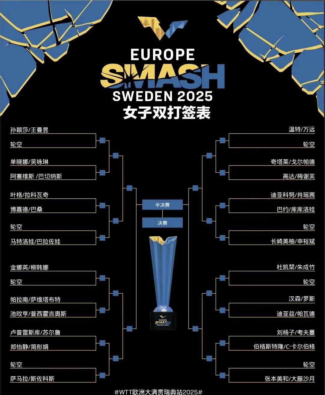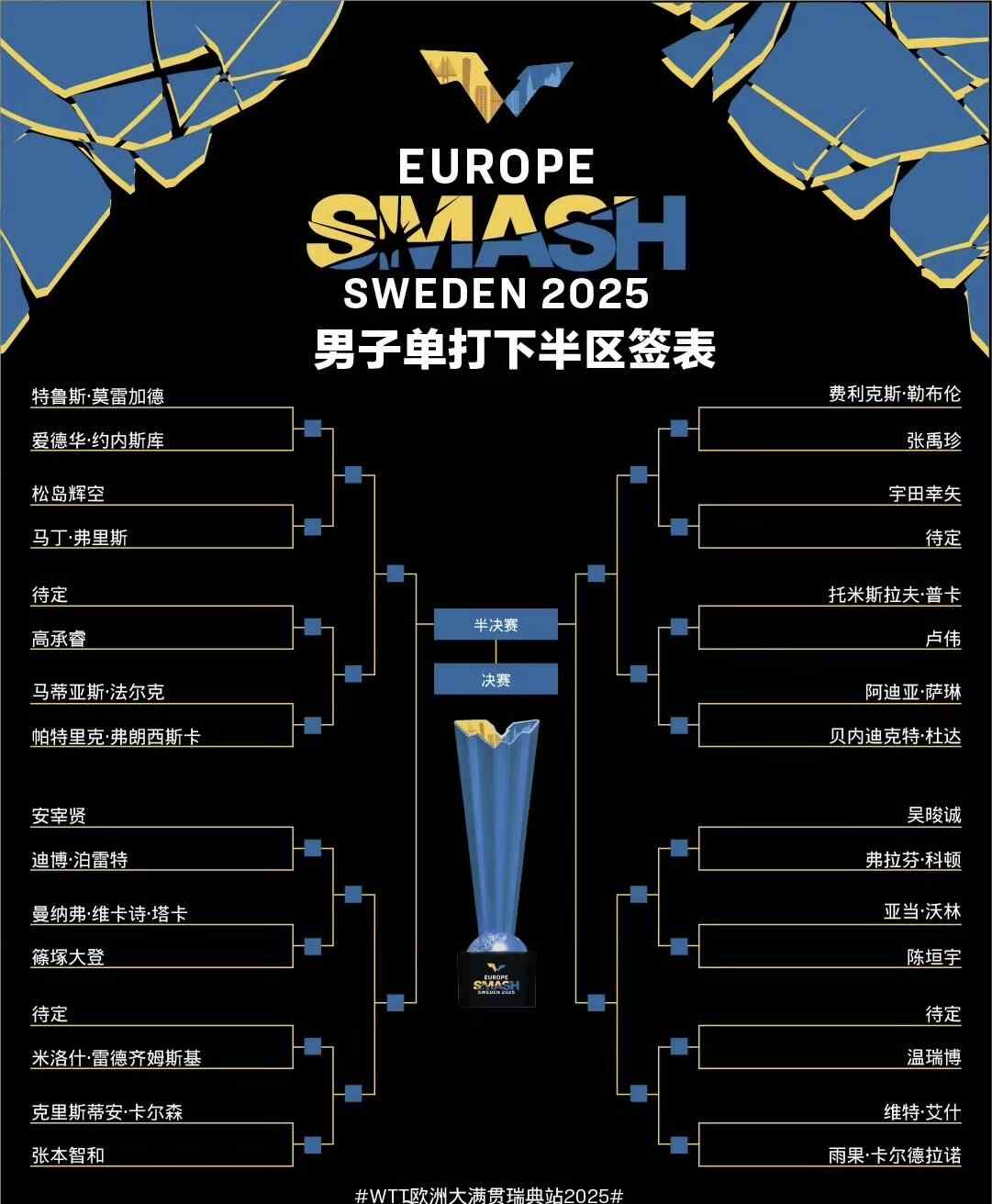 北京时间8月16日,2025年世乒联(WTT)欧洲大满贯瑞典站抽签结束。