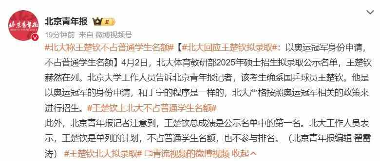 北大工作人员表示,王楚钦是单列的计划,不占普通学生名额,也不参与排名。