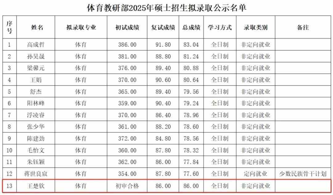 4月2日,北大体育教研部2025年硕士招生拟录取公示名单。名单中出现了王楚钦的名字,表格显示初审合格,复试成绩86分,总成绩86分。