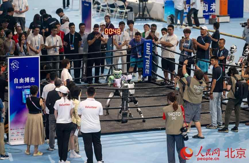 人形机器人正在进行自由搏击比赛。人民网记者 翁奇羽摄