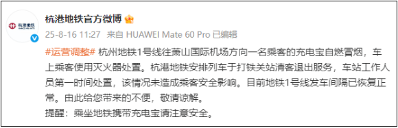 杭州地铁1号线往萧山国际机场方向一名乘客的充电宝自燃冒烟,车上乘客使用灭火器处置。杭港地铁安排列车于打铁关站清客退出服务,车站工作人员第一时间处置,该情况未造成乘客安全影响。目前地铁1号线发车间隔已恢复正常。由此给您带来的不便,敬请谅解。