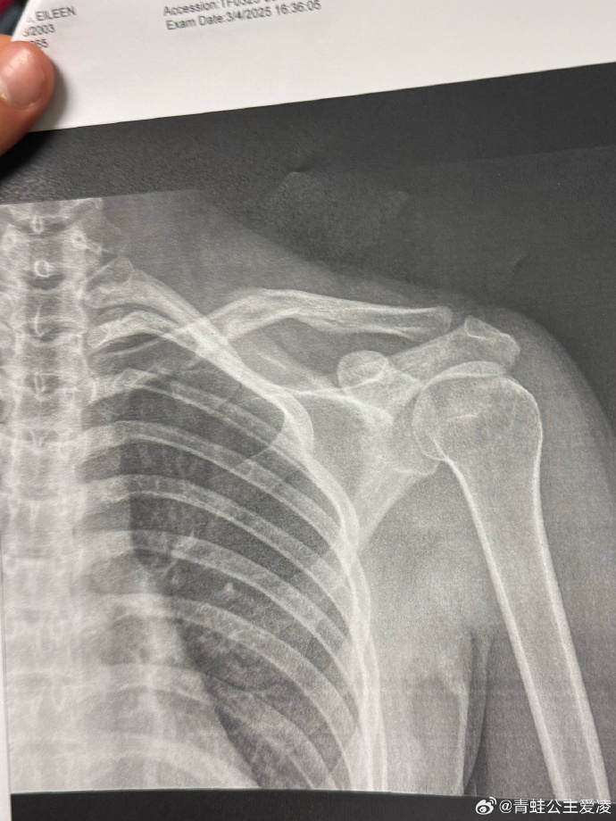 3月9日,谷爱凌在社交媒体晒出肩部骨折的X光照片,并配上一个心碎的表情,X光照片显示的日期是3月4日,目前尚不得知谷爱凌本次的伤病是新伤还是旧伤。