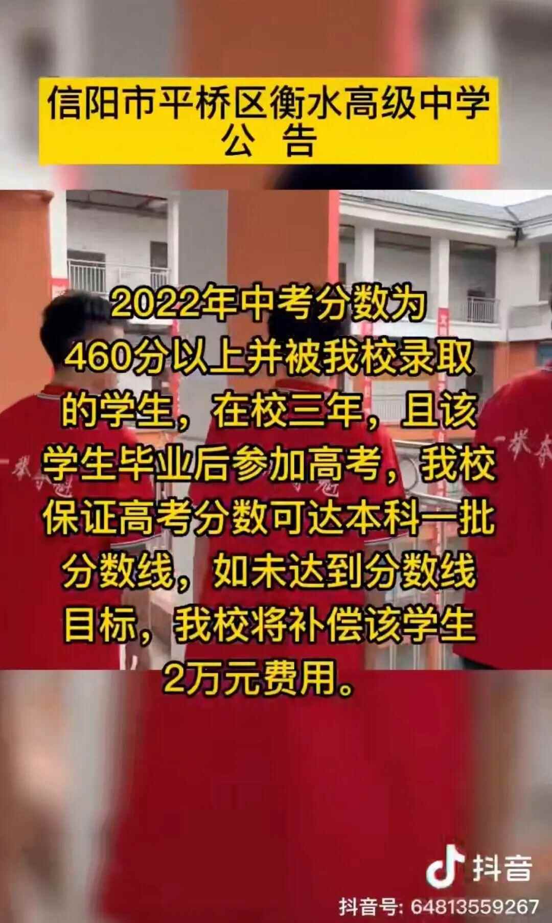 牛先生提供的视频为《信阳市平桥区衡水高级中学公告》,该视频称:“2022年中考分数为360分至460分并被我校录取的学生,在校三年,且该学生毕业后参加高考,我校保证高考分数可达本科分数线,如未达到分数线目标,我校将补偿该学生2万元费用。”