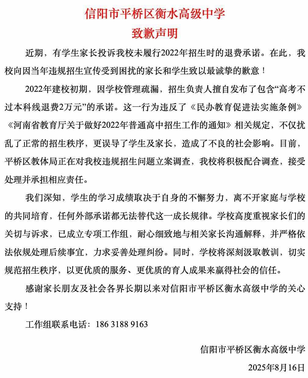8月16日,信阳市平桥区衡水高级中学发布致歉声明: