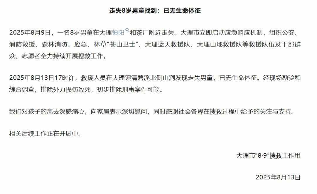 2025年8月13日17时许,救援人员在大理镇清碧溪北侧山涧发现走失男童,已无生命体征。经现场勘验和综合调查,排除外力损伤致死,初步排除刑事案件可能。
