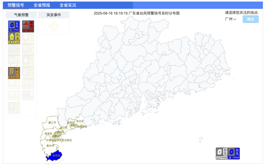 8月16日傍晚起,广东西部沿海地区已陆续发布台风预警信号。截至16日18时19分,东起电白西至徐闻的沿海地区已发布台风白色或更高级别预警信号,其中徐闻直接发布台风蓝色预警信号。