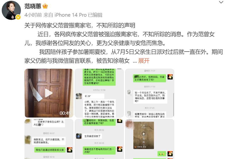 8月16日,已87岁高龄的中国当代书画大家范曾相关传闻引发关注。16日晚,范曾女儿@范晓蕙 在个人微博发声称,父亲被妻子徐萌带离住所后失联,住所被贴封条,库房珍品被搬走,部分老员工被辞退,且徐萌曾威胁员工不得外泄消息。全文如下:
