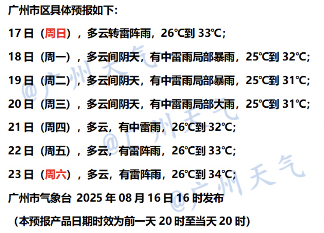广州市气象台8月16日预计,17日至21日,广州将逐渐受热带系统外围环流影响,雷雨再趋明显。展望22日后,广州将转多云有雷阵雨天气。