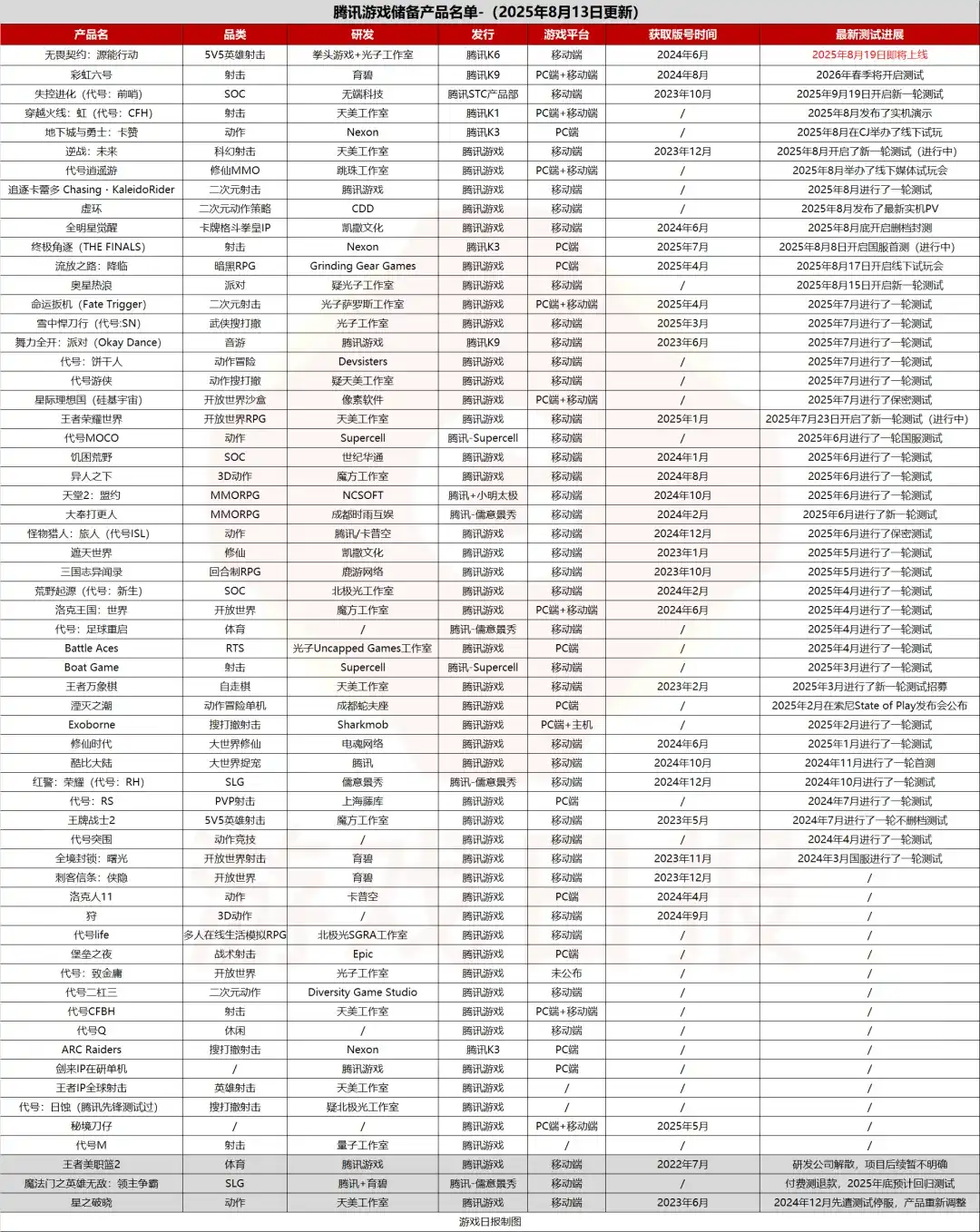 除此之外,在游戏日报整理出的腾讯储备游戏最新名单中(含61款产品,见底部),有大约10款产品已开发至较高完成度: