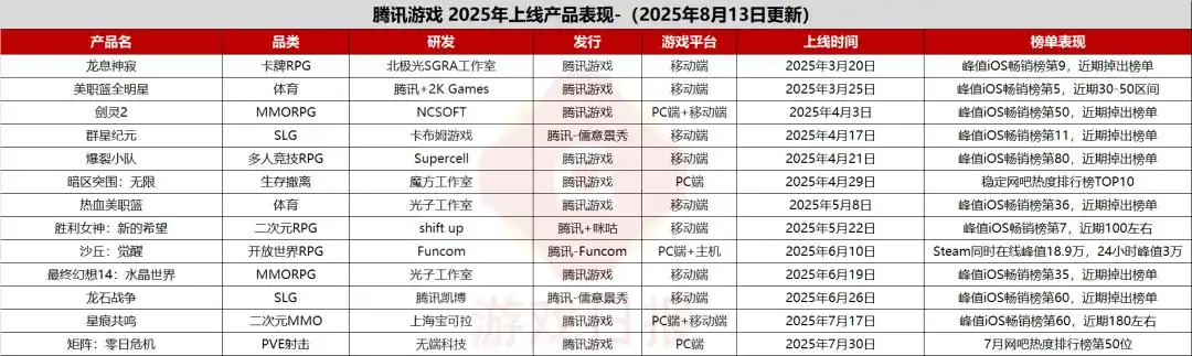 经游戏日报统计,今年腾讯有13款新游上线/发售。