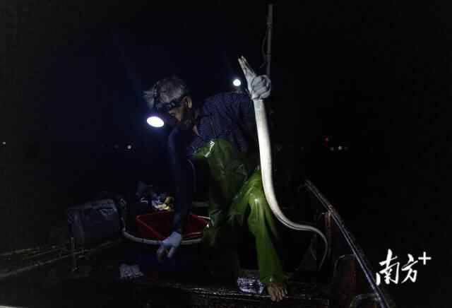 凌晨1时,汕头潮阳区海门镇,练江出海口,三位渔民准备出海,他们的小渔船长约5米,宽不足1.5米。杨英烈、杨举波两兄弟和超叔是固定搭档,他们均是海门本地人,在出海口捕鱼已二十多年。