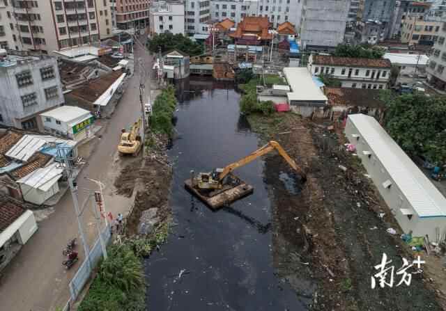 2018年,汕头潮阳区谷饶镇,挖掘机正在练江支流谷饶溪清理淤泥。
