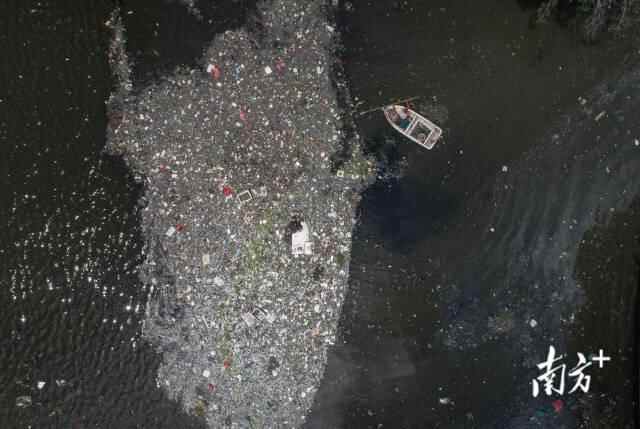 2018年,汕头潮阳区贵屿镇,工作人员正在清理练江支流上的垃圾。