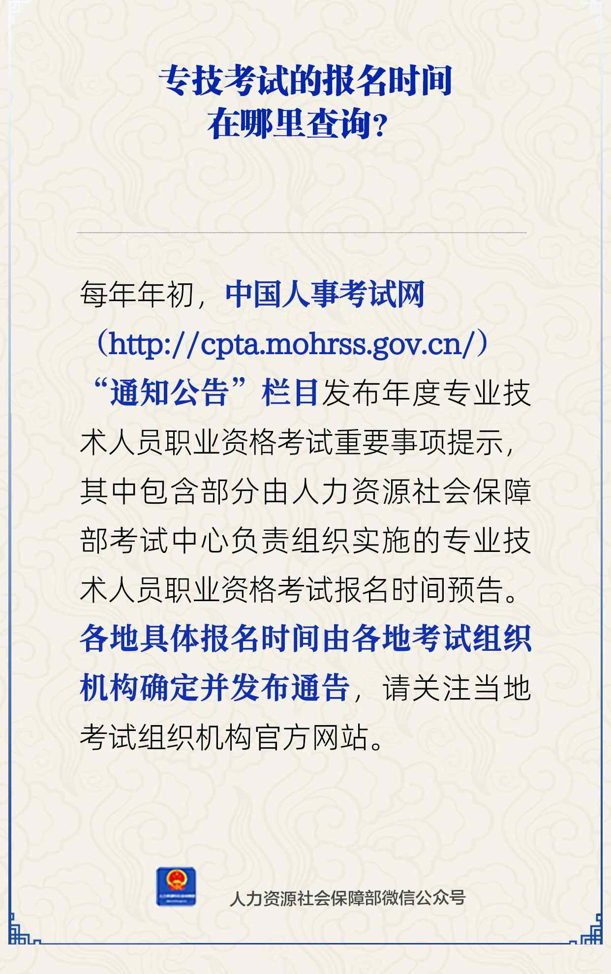 专技考试的报名时间在哪里查询?人社部8月14日通过官方微信公众号作出解答。