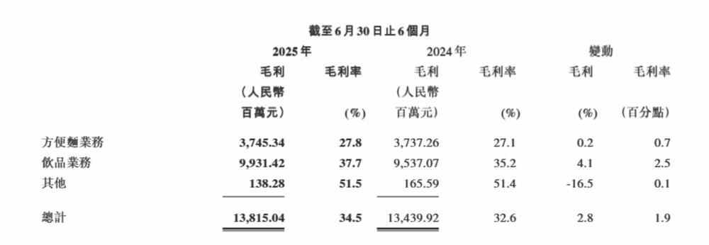 数据显示,今年上半年,康师傅饮品业务毛利率为37.7%,较2024年同期提高2.5个百分点。由于毛利率同比提高,令饮品业务2025年上半年股东应占净利润提高19.7%至13.35亿。