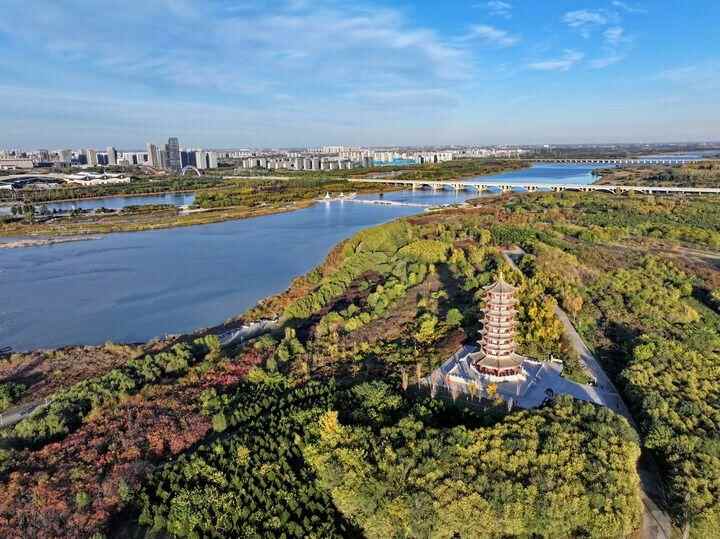 河北省石家庄市滹沱河沿岸景色(2024年11月4日摄,无人机照片)。新华社记者 牟宇 摄