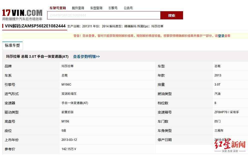 标的物情况显示,这台玛莎拉蒂的厂牌型号为玛莎拉蒂牌ZAMSP56E,车架号为ZAMSP56E2E1082444,出厂日期为2013年09月01日。红星资本局使用17位车架号查询显示,该车型属于玛莎拉蒂总裁(Quattroporte)系列,于2013年3月12日上市,参考价为142.15万。不过,目前该款车型已经停产,停产日期为2015年3月20日。