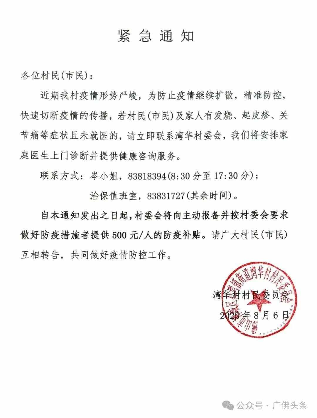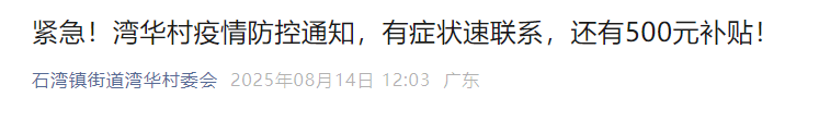 8月14日,佛山市禅城区石湾镇街道湾华村委会发出紧急通知:即日起凡主动向村委会报备个人/家庭防疫相关信息,并严格按村委会后续防疫指引落实相关措施的村民,经核实确认后,可获得500元/人的防疫补贴!