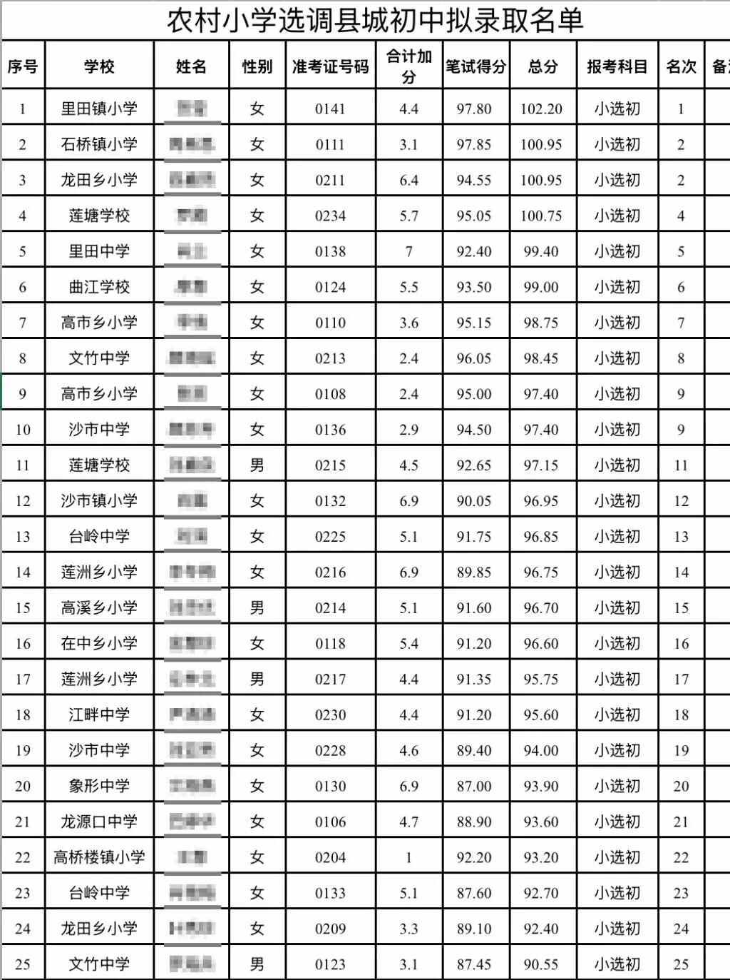 而在当地“农村小学选调县城初中拟录取名单”中,拟录取的最低总分为90.55分。