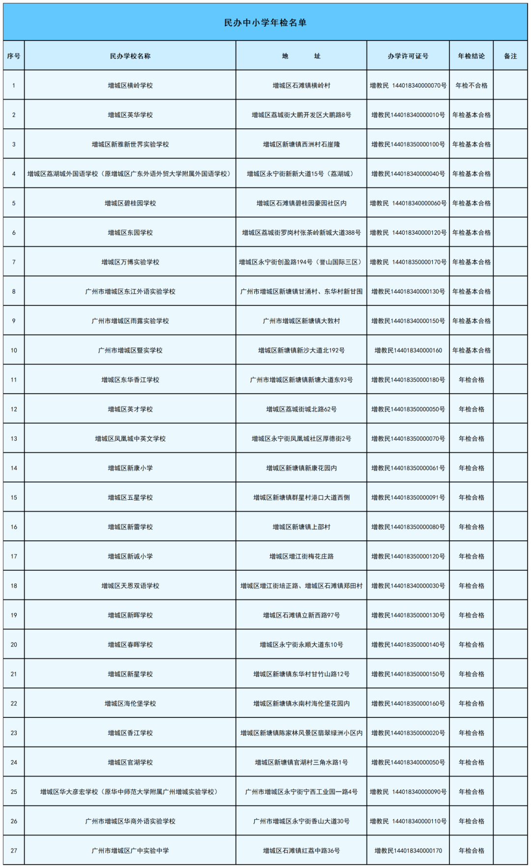 民办中小学方面,增城区横岭学校年检不合格;增城区英华学校、增城区新雅新世界实验学校、增城区荔湖城外国语学校、增城区碧桂园学校、增城区东园学校、增城区万博实验学校、增城区东江外语实验学校、增城区雨露实验学校、增城区暨实学校等9所年检基本合格;其余参加年检的民办中小学均合格。