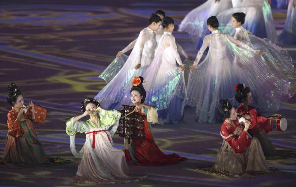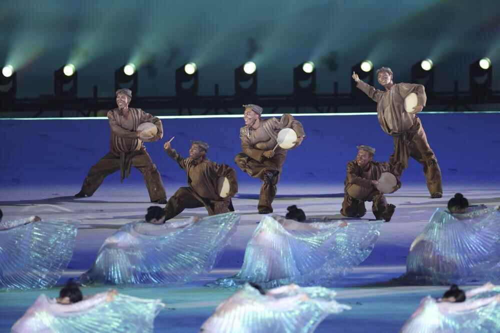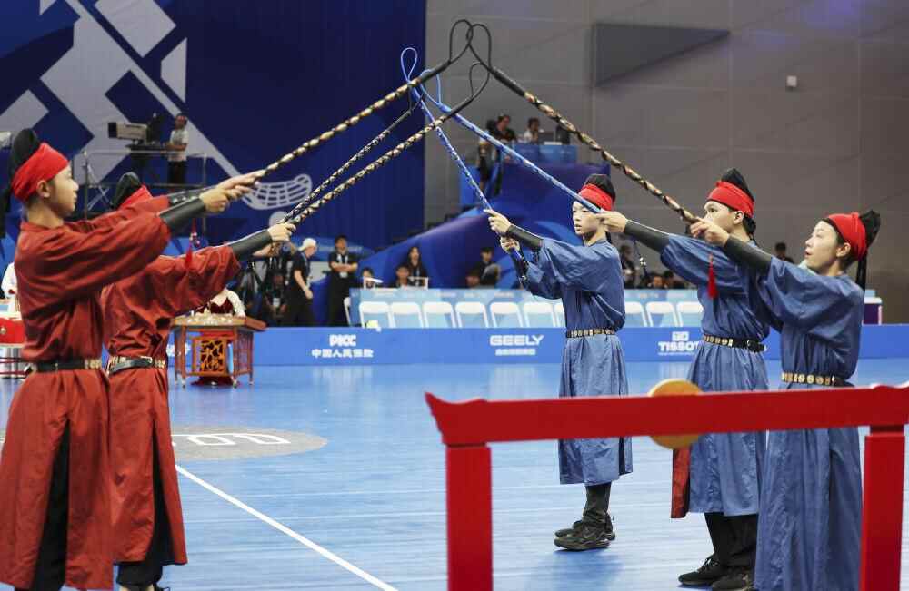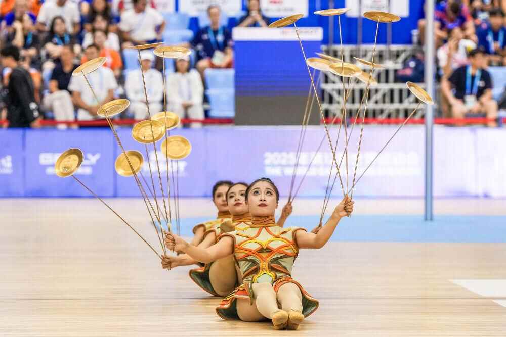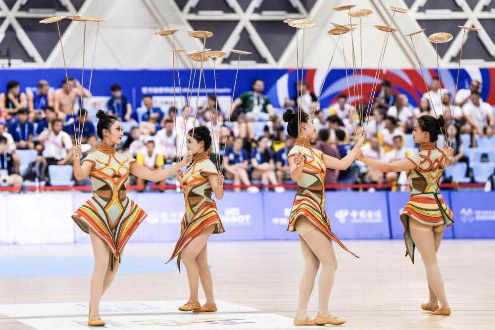 ↑8月12日,演员在成都世运会荷球混合团体赛决赛铜牌赛间隙进行杂技表演。