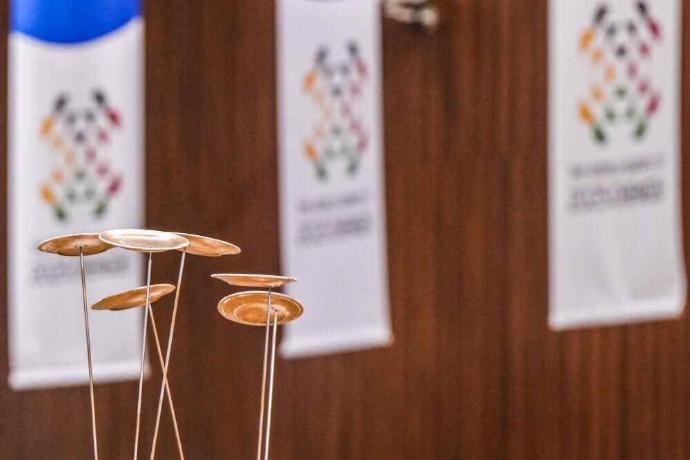 ↑8月12日,冠军德国队球员在成都世运会男子沙滩手球颁奖仪式上查看奖牌。