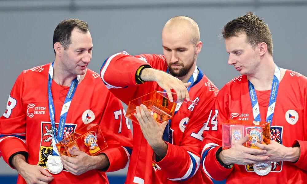 ↑8月11日,亚军捷克队球员在成都世运会男子单排轮滑球颁奖仪式上查看纪念品。