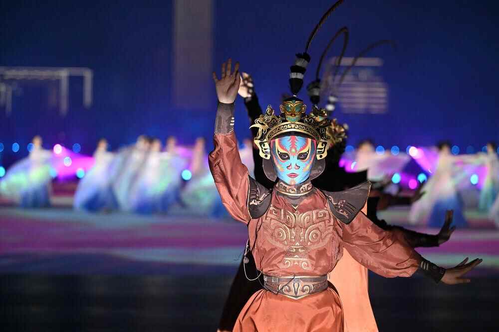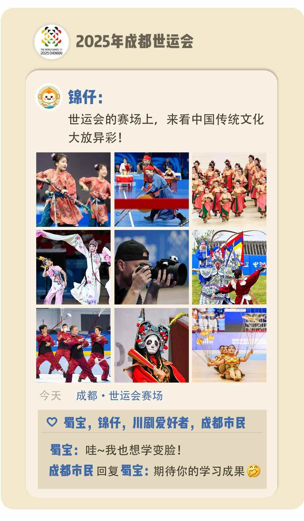 ↑8月10日,川剧变脸表演者在成都世运会技巧和蹦床比赛决赛前进行暖场表演。