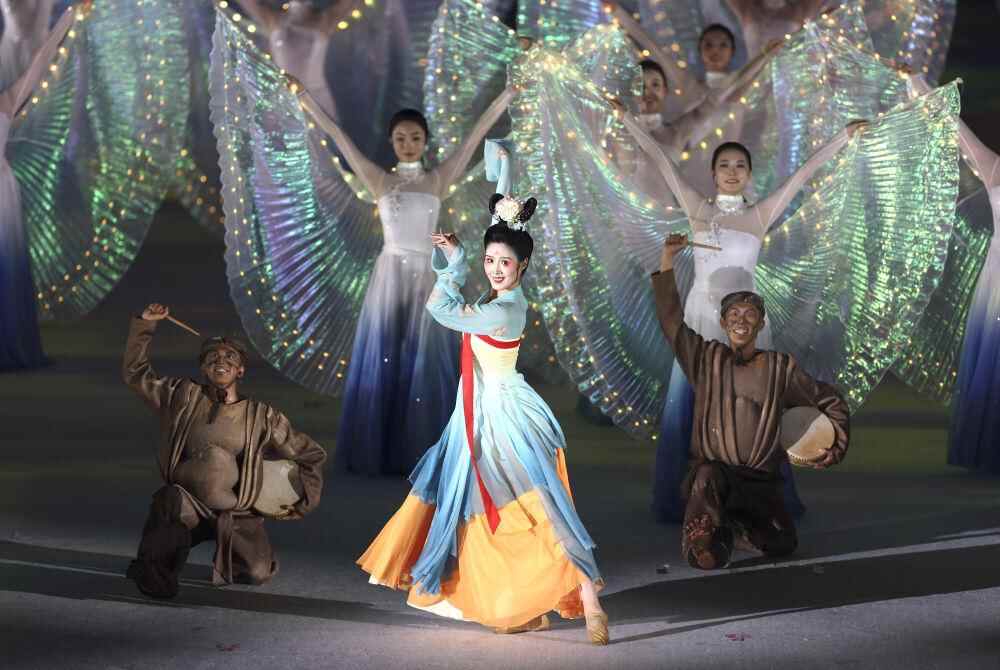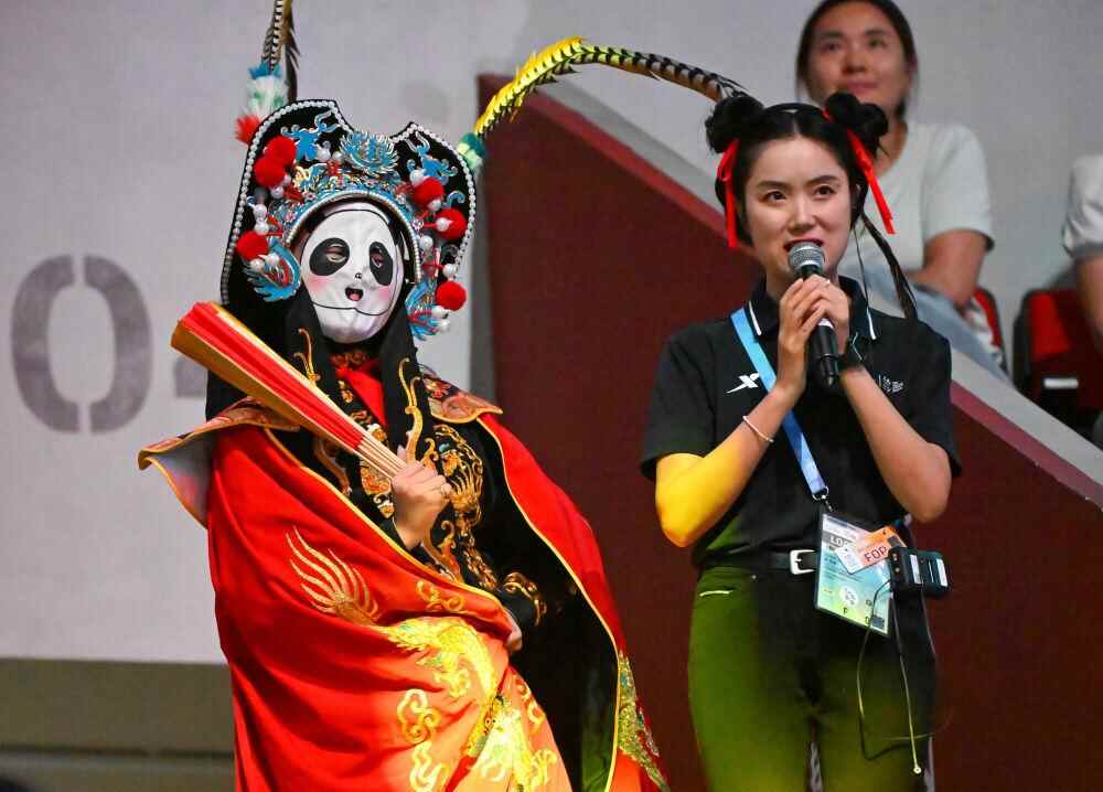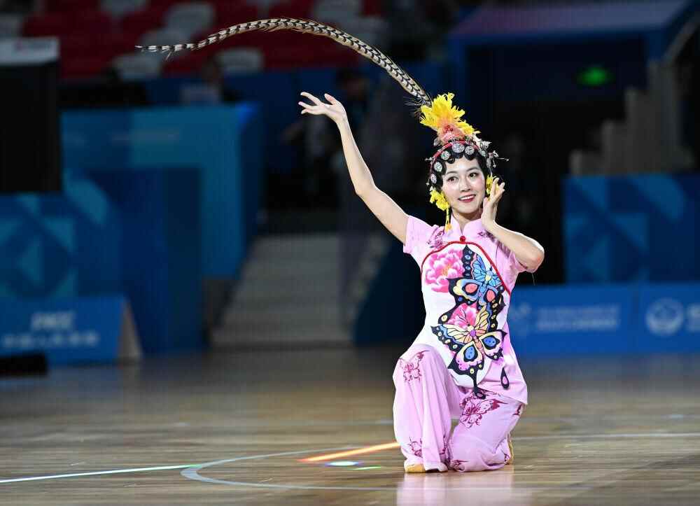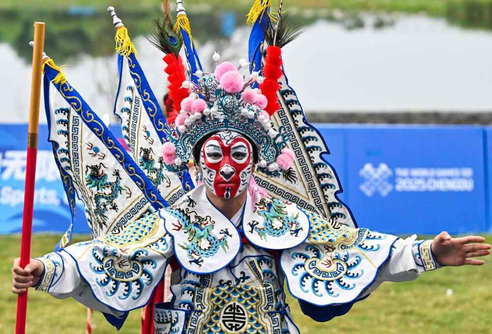 ↑8月8日,演员在成都世运会射准射箭复合弓混合团体决赛颁奖仪式前表演川剧。