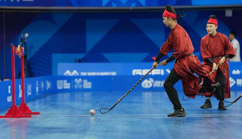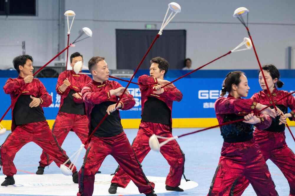 ↑这是8月6日在成都世运会软式曲棍球女子A组预赛前拍摄的步打球表演。